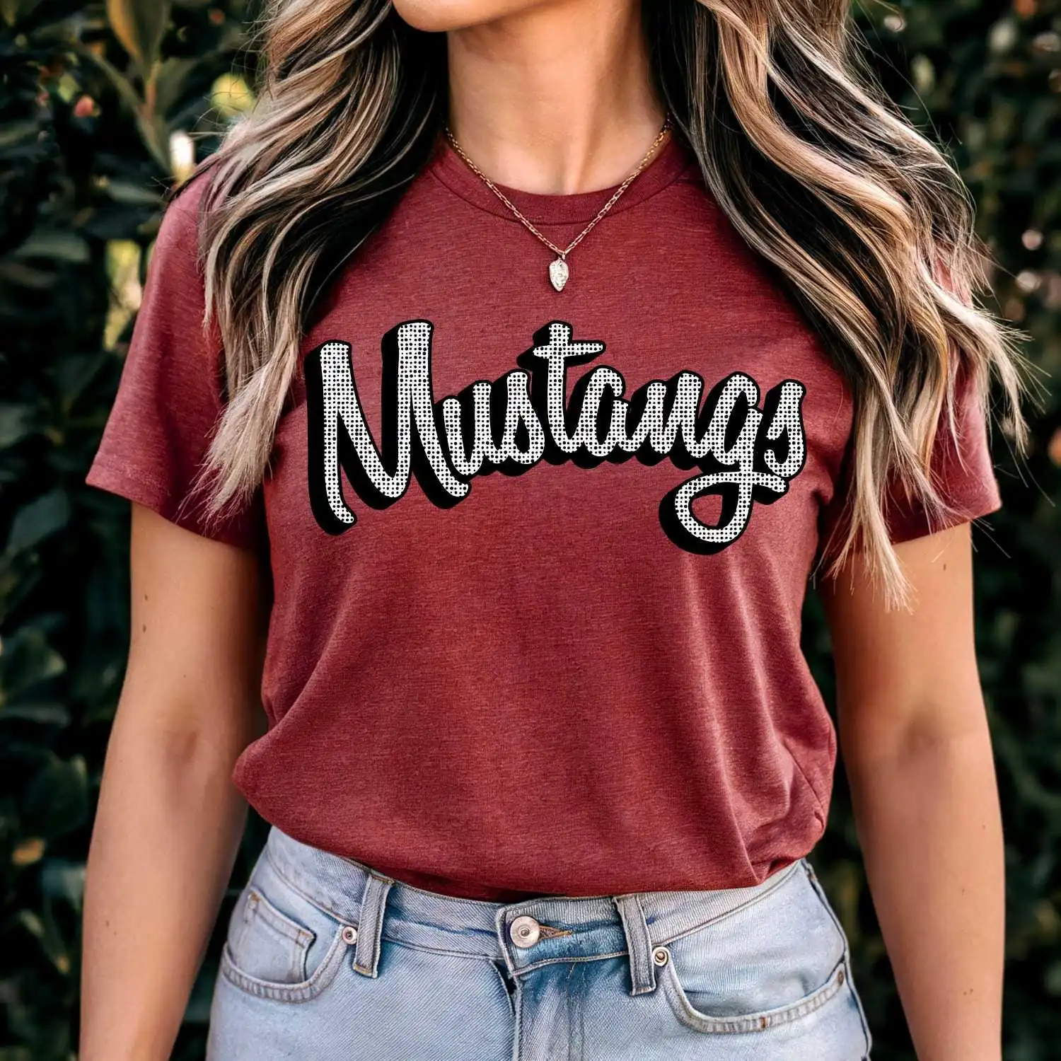 MUSTANGS polka dot script t-shirt, mascot team Spirit wear for baseball, football, great for teachers, Back to school, mascot apparel